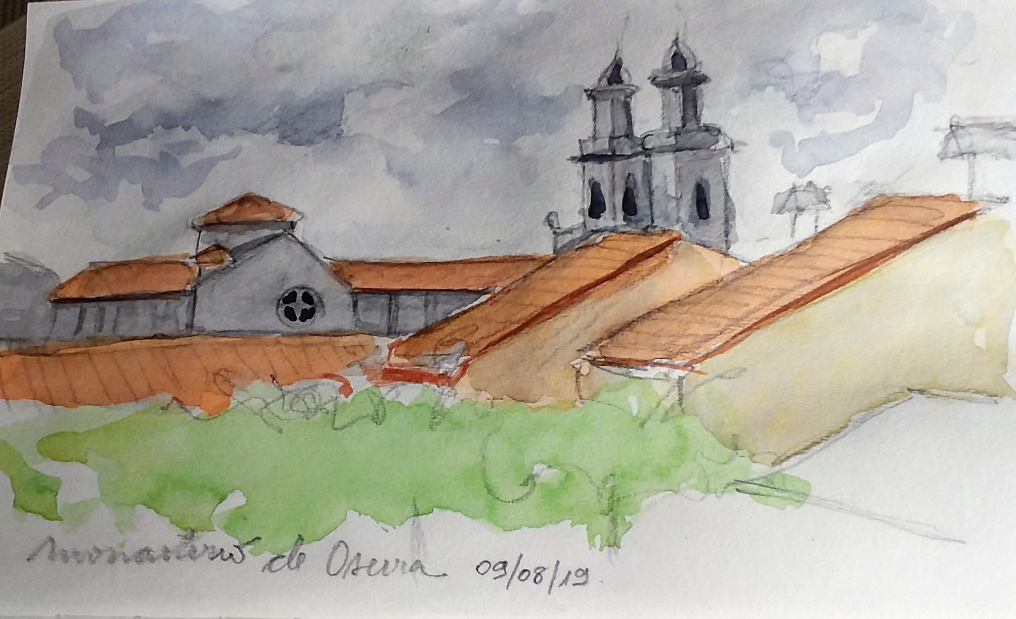 Hoy traigo un dibujo del Monasterio de Oseira, en una vista desde una zona alta y también uno, especialmente rápido, que hice cuando me paseaba por los senderos del bosque cercano. Son bocetos con color, que fue dado en casa con acuarela. Hace tiempo iba con todos los bártulos encima y daba el color in situ, pero con el tiempo he pasado a hacer el dibujo con el modelo delante y dar el color en casa. Este cambio fue por simples cuestiones de tiempo y logística, es evidente que el tiempo no da para todo cuando uno va de excursión, y cargar con todo lo necesario para colorear es bastante engorroso. Al final no queda mas remedio que encontrar un compromiso entre el dibujo y los aspectos mas prácticos.