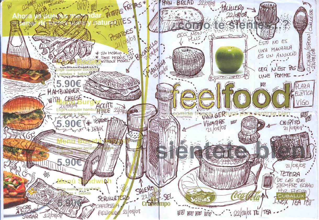 Una buena forma de solucionar la falta de tiempo para dibujar, es aprovechar esos momentos en los cuales nos vemos obligados a esperar, nos guste o no. Uno de los más característicos es cuando estás esperando a ser atendido en un restaurante. Hoy en día lo habitual es que los manteles sean individuales y de papel ¿He dicho papel? Sí, papel. Eso donde normalmente se dibuja. Pues por que no dibujar en el mantel. Lo que sobran son modelos a nuestro alrededor, podemos dibujar las personas, lo que tenemos en la mesa, como los saleros, cestillo del pan, pan, tenedor, llaves, etc. Podemos aprovechar para hacer un poco de caligrafía y mejorar la letra. Podemos hacer ejercicios como hacer trazos sin más (un día tengo que hablar de eso). En fin que las posibilidades son totalmente infinitas.