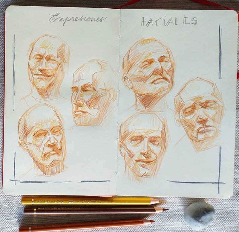 Hoy traigo unos dibujos de expresiones faciales, que además abren un nuevo sketchbook. Los dibujos están hechos con lápices de color. Como ya dije es fundamental estar practicando siempre, sin parar. Estudiar expresiones faciales es muy bueno, sobre todo si uno quiere dedicarse al diseño de personajes. En este caso elegí unas fotos de referencia que además me permitían practicar sombras, intenté también sintetizar todo lo posible, otro muy buen ejercicio que yo tengo que practicar mucho más. Espero que os gusten.
