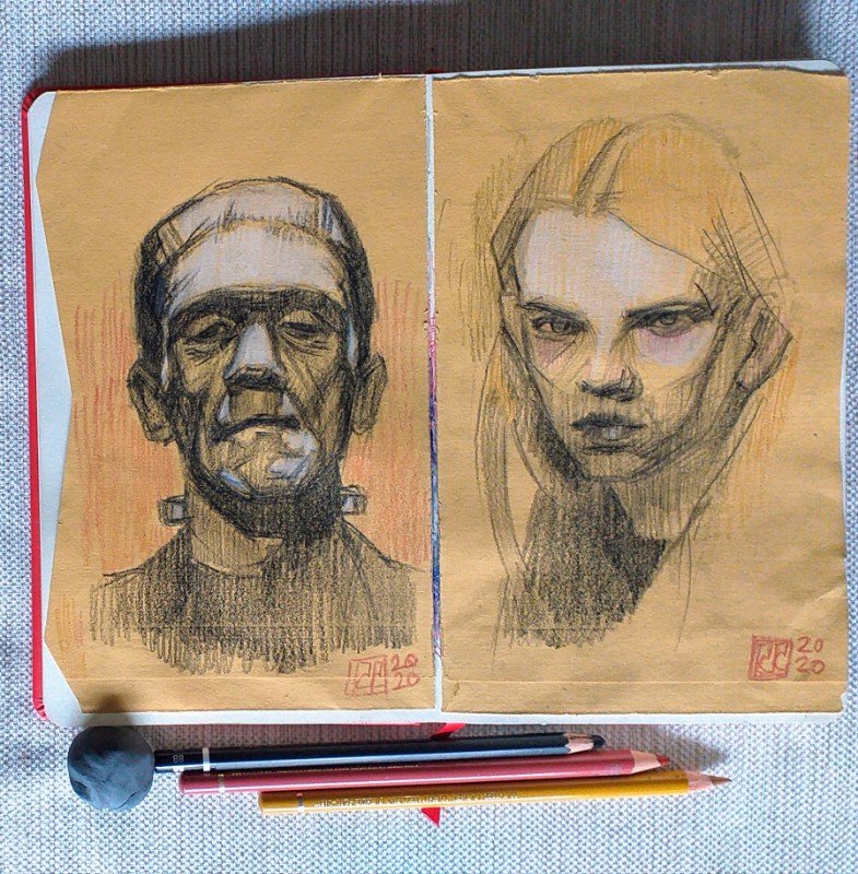 Hoy traigo dos retratos, uno más conocido que le otro. Por un lado El Monstruo de Frankenstein y la que podría ser una imagen de la niña que sale en la película, al menos en la versión original, pero ya de mayorcita. Imaginando una realidad alternativa, podriamos pensar que tal vez la niña fue adoptada por Mr. Frankenstein Jr, y que ambos vivieron una vida diferente. No muy acorde con las normas sociales, pero en cualquier caso muy personal. Las miradas de ambos son diferentes a lo que se podría esperar, una más amable tal vez y la otra más inquietante ¿Cual es cual? A cada uno de juzgar.