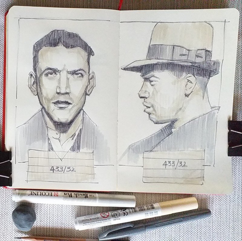Siguiendo con los retratos se me ha ocurrido usar como modelo antiguas (muy antiguas) fotos de la policía. En concreto fichas policiales de los primeros tiempos de la fotografía. Estoy seguro de que si a mi, y a muchos de nosotros, nos hubieran tomado fotos con aquellos viejos aparatos, y en aquellas condiciones, seguro que también pareceríamos delincuentes peligrosos. La técnica usada en el dibujo, es la que me tira estos días, es decir los rotuladores tipo acuarela. Aún le puedo sacar mas jugo, ya sabéis que cuanto más se usa una técnica mejor se conoce y más matices se le pueden sacar. Espero que os guste.