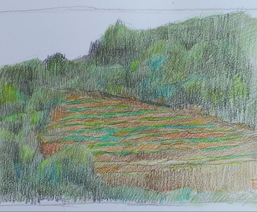 Los lapices de colores son muy útiles cuando no quieres cargar con mucho material en tu excursiones, si además los usas sobre papel de acuarela como en este dibujo, el resultado llega a ser muy expresivo. Ideal para soltarse y dejar la mano en total libertad. El papel de acuarela al tener un grano grueso no deja que la cera del lápiz se extienda bien, … Continúa leyendo Paisaje: abstracción VI