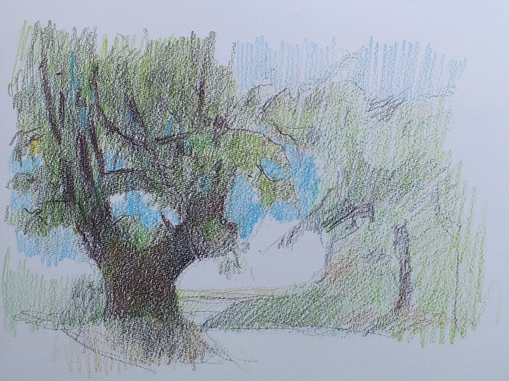 Los lapices de colores son muy útiles cuando no quieres cargar con mucho material en tu excursiones, si además los usas sobre papel de acuarela como en este dibujo, el resultado llega a ser muy expresivo. Ideal para soltarse y dejar la mano en total libertad.