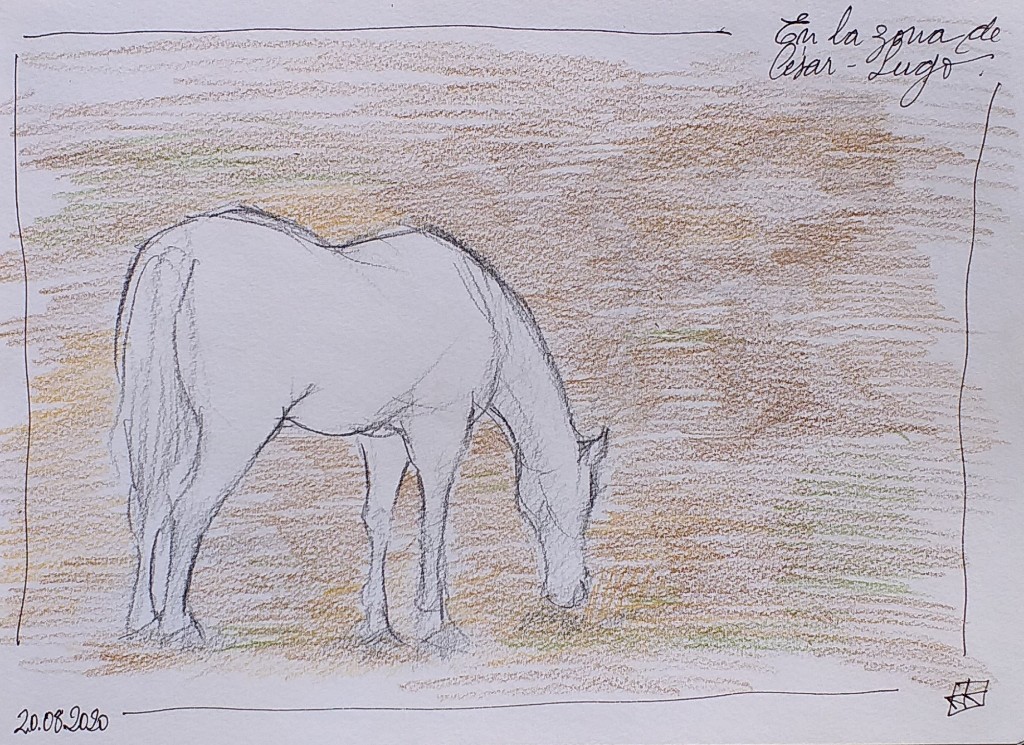como no todo van a ser paisajes hoy traigo un sketch rápido de un caballo. Puedo decir que me costó trabajo hacerlo, ya que el animal se quedaba quieto apenas unos segundos, hasta que finalmente me dió una oportunidad. Se paró a comer unos minutos seguidos, aunque con movimientos de cabeza de un lado a otro. Son los gajes del dibujo en vivo. Aunque como ya dije en algun post, mejor poco y bueno que mucho y de poca calidad.