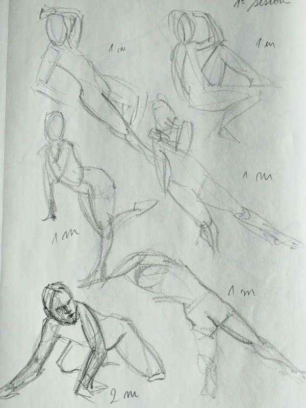 Esta expresión en inglés para mí es intraducible y por eso la uso. A lo mejor «dibujos de expresión» podría valer pero en realidad no me convence. Al grano. No soporto este tipo de dibujos, mejor dicho no soporto el ejercicio en sí ¿por qué? pues por la limitación del tiempo. Dicen que es muy bueno para no pensar en lo que se dibuja y recoger solo lo esencial de la pose, la expresividad, y yo digo ¿de verdad no pensar es bueno? A lo mejor a veces no discuto, pero la mayoría del tiempo pensar es bueno. Sea como sea de vez en cuando me da por hacer este ejercicio, durante 20 minutos más o menos, y cuando termino pienso «he cumplido, hasta dentro de 1 año». No me gusta que me presionen, en general, así que dibujando aún menos. Esa idea de que limitar el tiempo es bueno, para mí aún no es evidente. Puede que dentro de unos años lo sea y me arrepienta de estos párafos, pero que se le va a hacer, la vida es así.