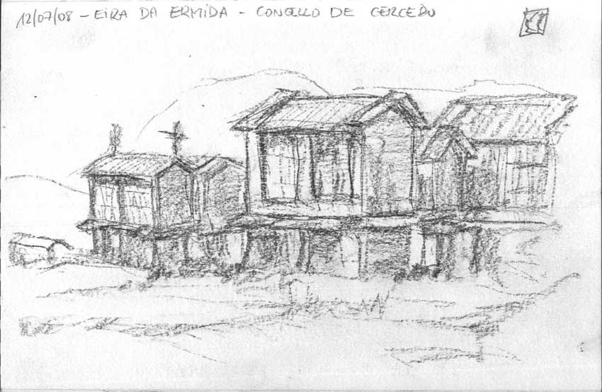 De vez en cuando conviene visitar el baúl de los recuerdos, siempre acaban apareciendo cosas. Este dibujo me lleva unos cuantos años atrás, a un verano vagabundeando por carreteras secundarias ─uno más, como no─, disfrutando de ir despacio y descubriendo rincones de Galicia, de esos que se graban en la memoria para siempre. A veces los mayores tesoros está al lado de casa.