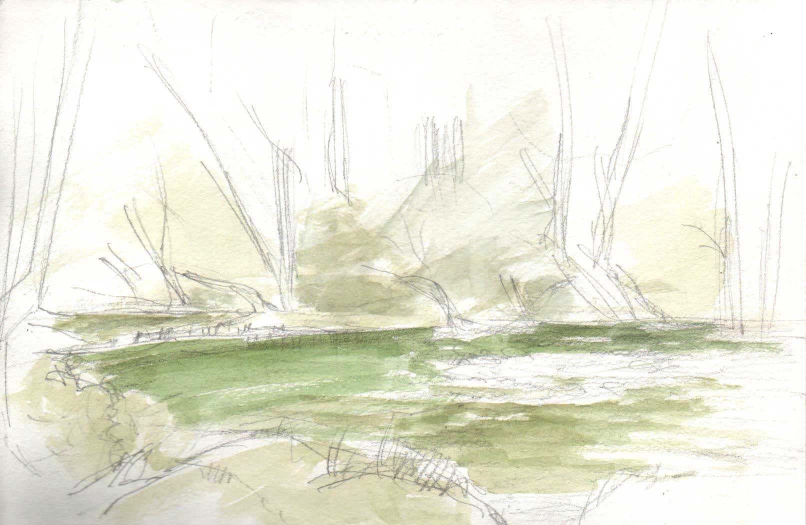 Confieso que cuando estoy en plena naturaleza, con las herramientas en la mano para dibujar o pintar me siento abrumado, casi siempre, ante la exhuberante abundancia de lo que mis ojos pueden ver, y mi cerebro no es capaz de procesar. Me suele pasar cuando los límites entre cada árbol, matorral, hierba, arbusto, camino, trono caído, tronco de pié, flor, charco, etc son difusos, cuando lo que tengo ante mí es una masa con verdes muy similares (algo muy frecuente en Galicia), que se diferencian solo por pequeños matices. Simplemente diría que me entra «vértigo» ante tanto material para dibujar. Una posible solución es elegir una zona en particular, bloquear mentalmente la entrada en la cabeza de todo lo demás, funciona. Pero ¿y sí queremos una vista de conjunto?¿Si lo que queremos es recoger todo el ambiente, las sensaciones, la luz, los sonidos….? Y por supuesto meter todo eso en una hojita de un cuadernito, y solo con los medios escasos que uno puede transportar consigo mismo, para no acabar rendido por llevar a cuestas medio estudio.
