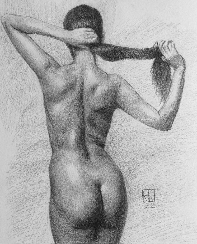 Hace mucho que no subo nada, supongo que será por que ya transmití todo lo que sé, asi que solamente queda subir dibujos. Este desnudo está realizado con base de grafito y terminado con carbón, o mejor dicho con grafito reforzado en su composición con carbón. Me costó mucho cogerle el gusto, pero se puede decir que ahora soy adicto a estos lápices; tanto que el grafito, mi amado grafito, ya no me parece lo mismo. Hay que reconocer que se logra una profundidad de los negros mucho mayor. Se trata concretamente de los lápices de Staedtler Mars Lumograh Black, 2B, 4B, 6B, y toques de 8B.